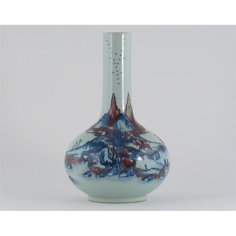 A Chinese bottle vase, decorated in iron red and blue with a landscape scene and figures crossing a bridge beneath willow with mountains in the background, 19th century, 37cm.