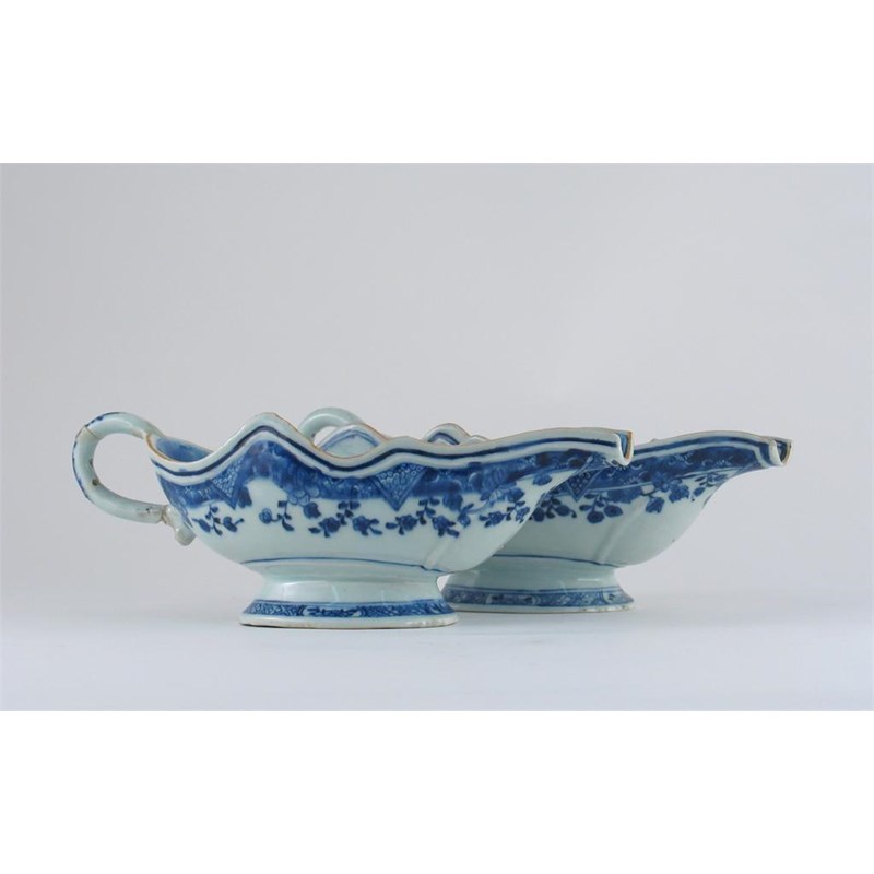 A pair of Chinese blue and white silver-shaped sauce boats, each painted with birds, rockwork, and flowers beneath pine trees. One handle damaged. 18th century, 25cm. (2).