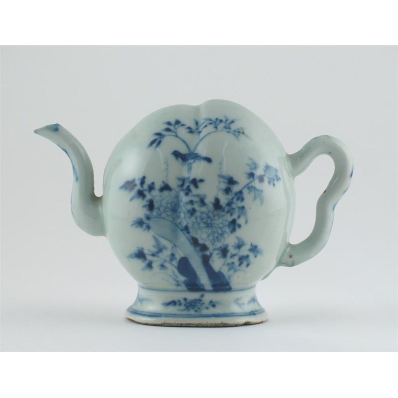 A Chinese blue and white Cadogan teapot, formed as a peach, and painted with birds perched amidst flowers and foliage, 19th century, 21cm.