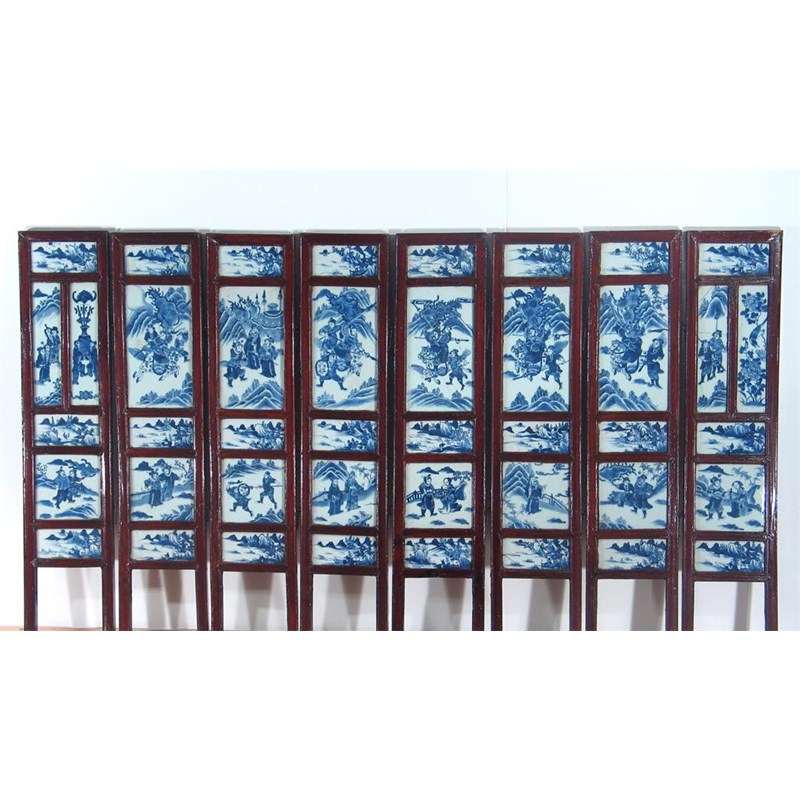 A Chinese eight panel screen, set with forty two blue and white porcelain panels, depicting figures in various pursuits in rocky landscapes. Some damages and repairs. 19th century, 145cm. long x 80cm. high. (8)