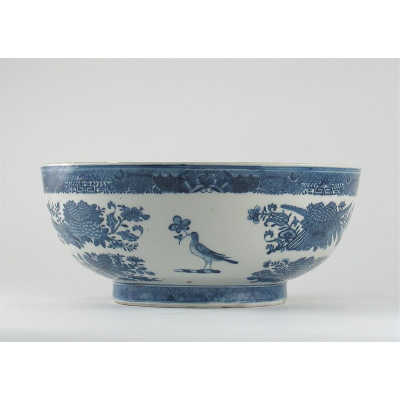 A Chinese armorial large bowl, painted in blue with a crest of Larken within a Fitzhugh band and borders. Small chips to the rim. 2nd half 18th century, 30cm.