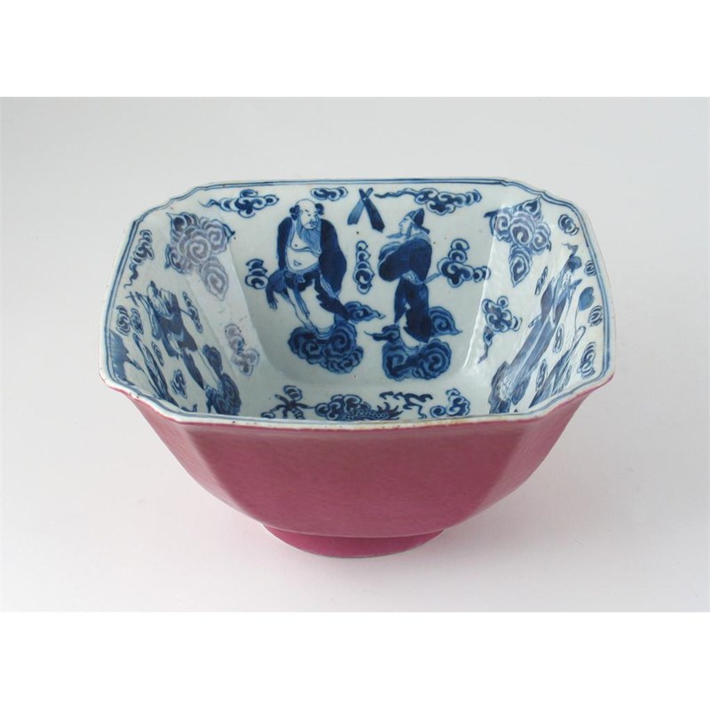 A Chinese square-section bowl, the interior painted in blue with the eight Daoist Immortals encircling a dragon, the exterior with a raspberry glaze, six character Xuande mark but 19th century, 26.5cm.