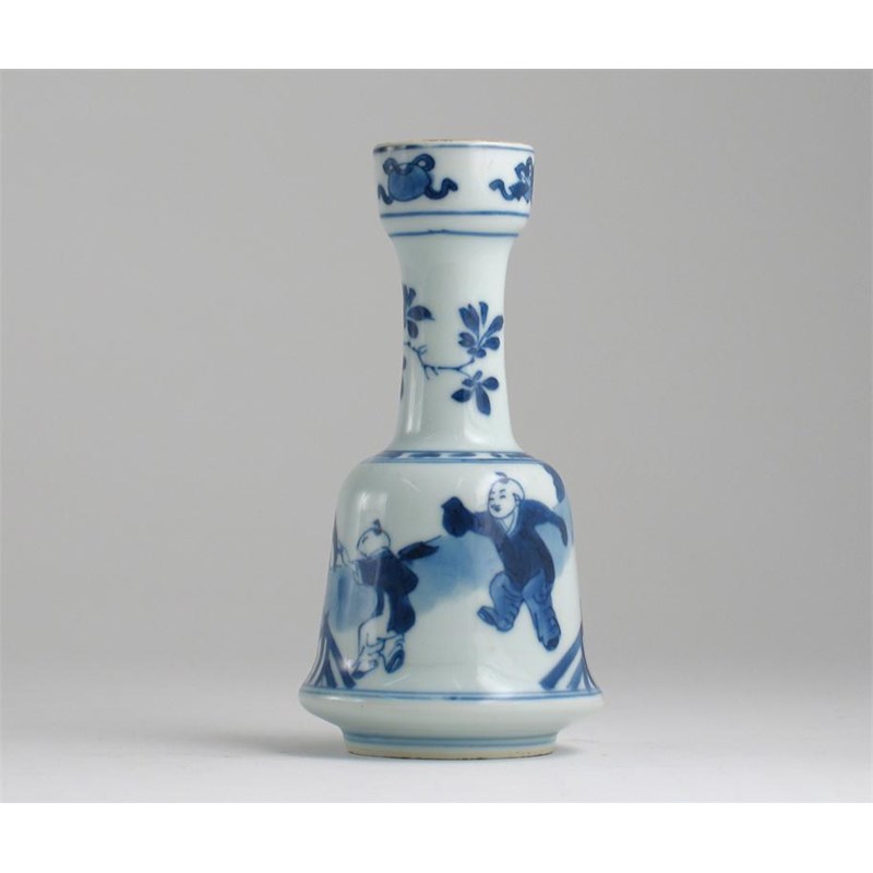 A Chinese blue and white bell-shaped candlestick, decorated with the wa wa playing on a fenced terrace, a flower spray round the narrow neck, beneath four auspicious symbols. Small frits. Six character Chenghua mark but Kangxi 1662-1722, 14cm.