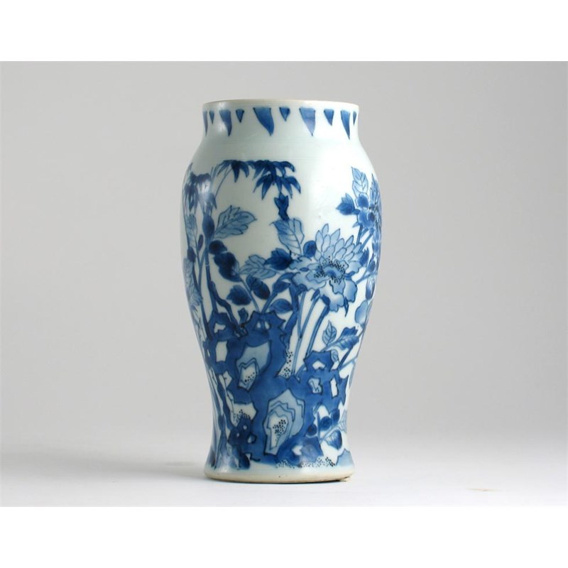 A Chinese blue and white Transitional vase, painted with bamboo, peony and four birds squabbling in mid air, beneath finely incised bands, c.1640, 19.5cm.