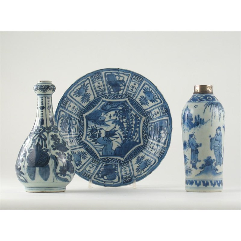 Two Chinese blue and white vases, and a moulded plate, variously decorated with panels containing flowers, insects and auspicious objects, one vase with two figures beneath a willow tree. All damaged. All 17th century, 18cm. (3)