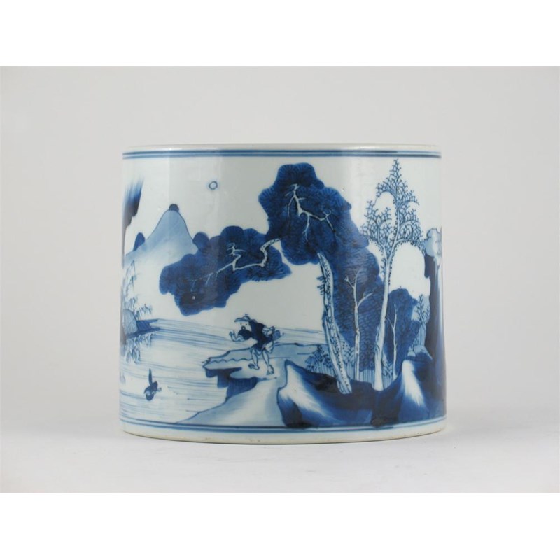 A Chinese blue and white brushpot, painted with a fisherman on a riverbank watching a swooping bird catch his fish while his rod lies at his feet, all in a continuous mountain river landscape. A hair crack. Kangxi 1662-1722, 16.5cm.