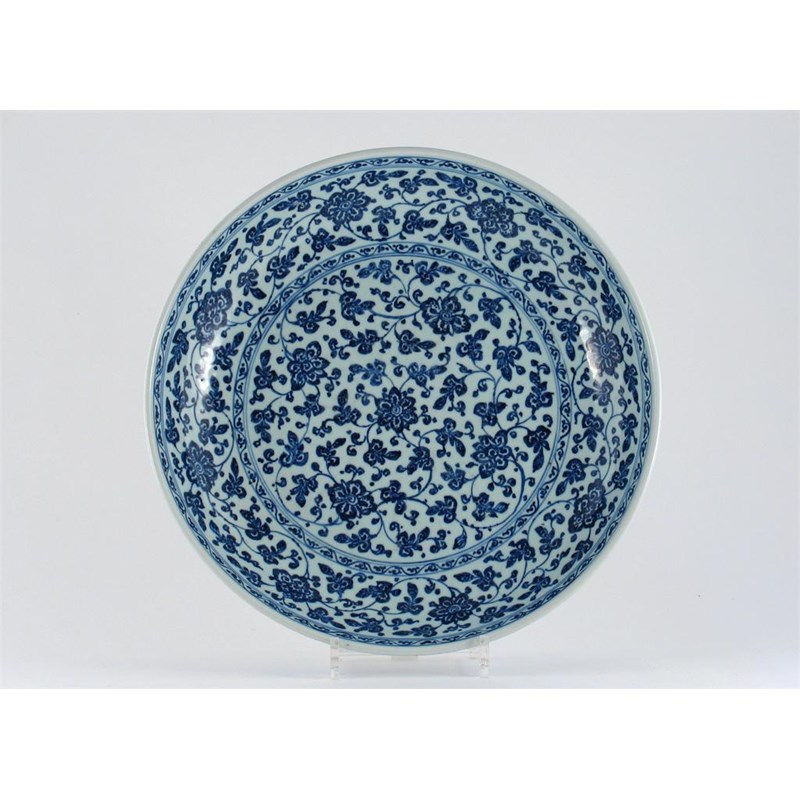 A large Chinese blue and white saucer dish, decorated with scrolling lotus flowers and leaves, Qianlong 1736-95, c.1780, unmarked, 37cm.