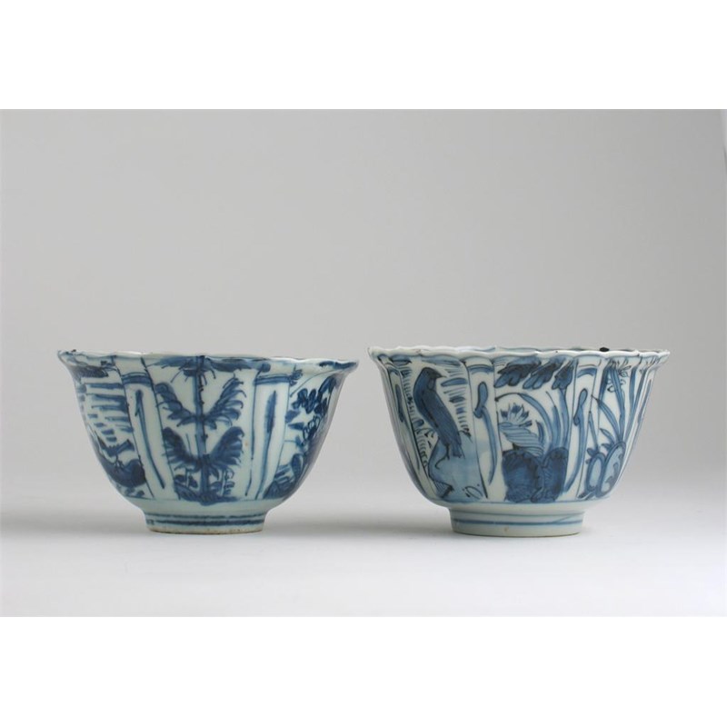 A Chinese blue and white Kraak porcelain small deep bowl, decorated with alternate panels of birds on rockwork and flowers, foliage and bamboo, and a similar bowl, Wanli 1573-1620, 12.5cm. (2)