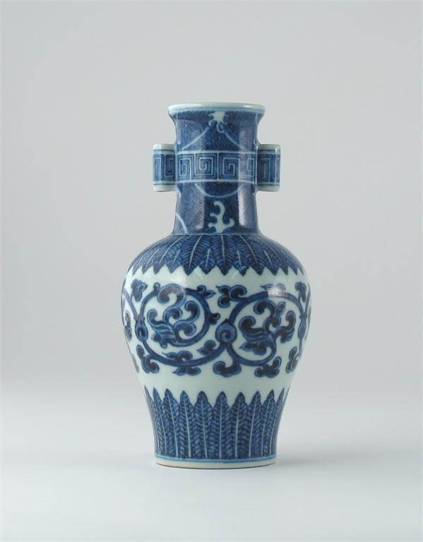 A Chinese blue and white Ming-style vase, painted with a frieze of archaic foliage between upright and pendant stiff leaves, the neck applied with a pair of cylindrical handles joined by a key fret band, Qianlong six character seal mark, perhaps of the period, 19.5cm. Cf. A similar vase in the National Palace Museum is illustrated in Blue and White Ware of the Ch'ing Dynasty, Book II, pl. 7.