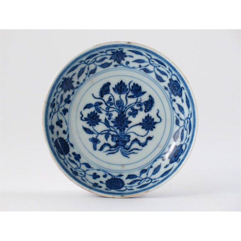 A Chinese Ming-style small saucer dish, decorated on the interior with a tied bouquet of lotus flowers and leaves, the rim and exterior with a continuous flower scroll. Small rim crack and chips. Qianlong six character mark and of the period 1736-95, 11.5cm.