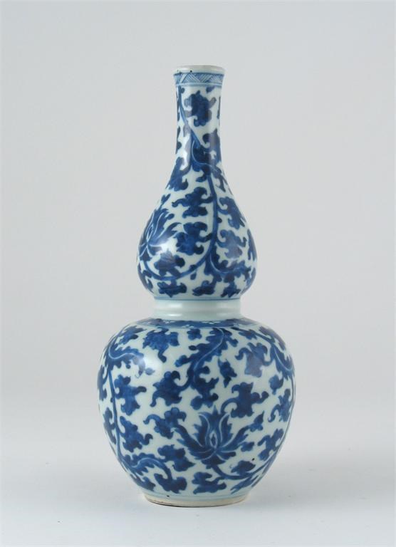 A good Chinese blue and white gourd vase, painted with scrolling foliage and lotus flowers, six character Chenhua mark but Kangxi 1662-1722, 23.5cm.