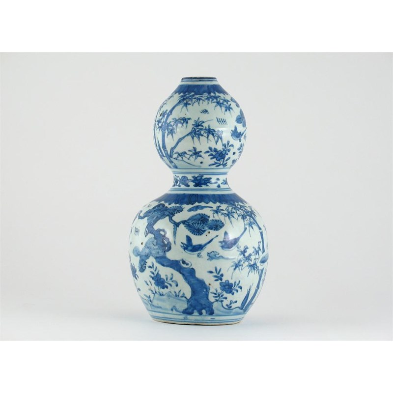 A Chinese blue and white double gourd vase, painted with sparrows in flight, amidst the three friends of winter, unmarked Wanli. The neck reduced. c.1600, 29cm.