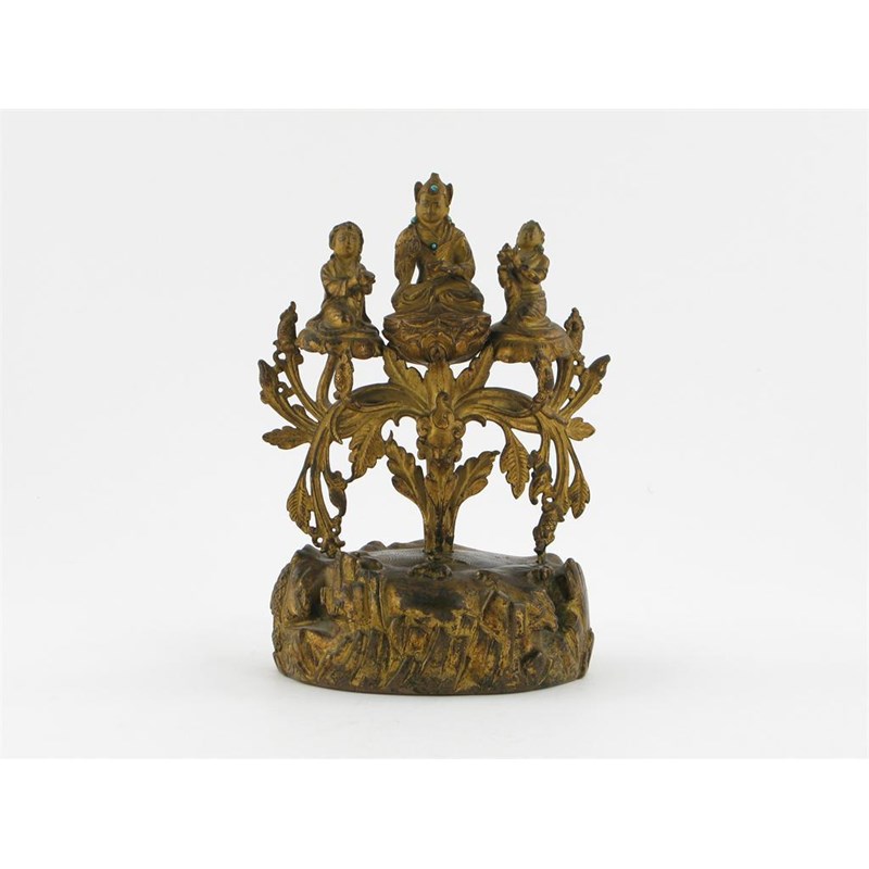 A rare Tibetan gilt bronze group, with the central figure of the Great Adept Padmasambhava seated in dhyanansana, on a lotus throne holding a vajra and patra, his consorts Mandarava, a Bengali princess and Tsogyal a Tibetan queen to his right and left respectively, all raised on an elaborate stand, 15th/16th century, 21.5cm. (3)