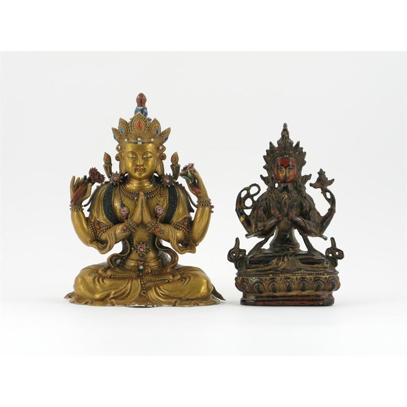Two Chinese figures of Sadaksari, one in bronze and lacquered in black, red and gilt, the other porcelain, decorated in gold and polychrome, the latter with a moulded seal mark, 18th century and later, some damages, 23cm max. (2)