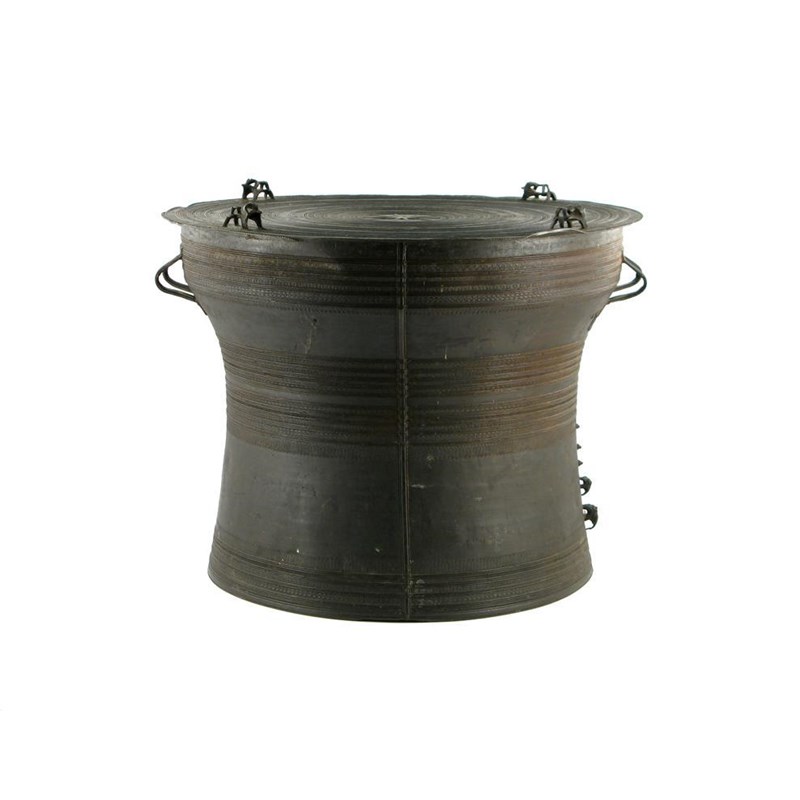 A large circular Indian drum, the top decorated with concentric bands and with four frog motifs, the waisted sides with double strap handles above elephants, probably 19th century, some dents, 60cm.
