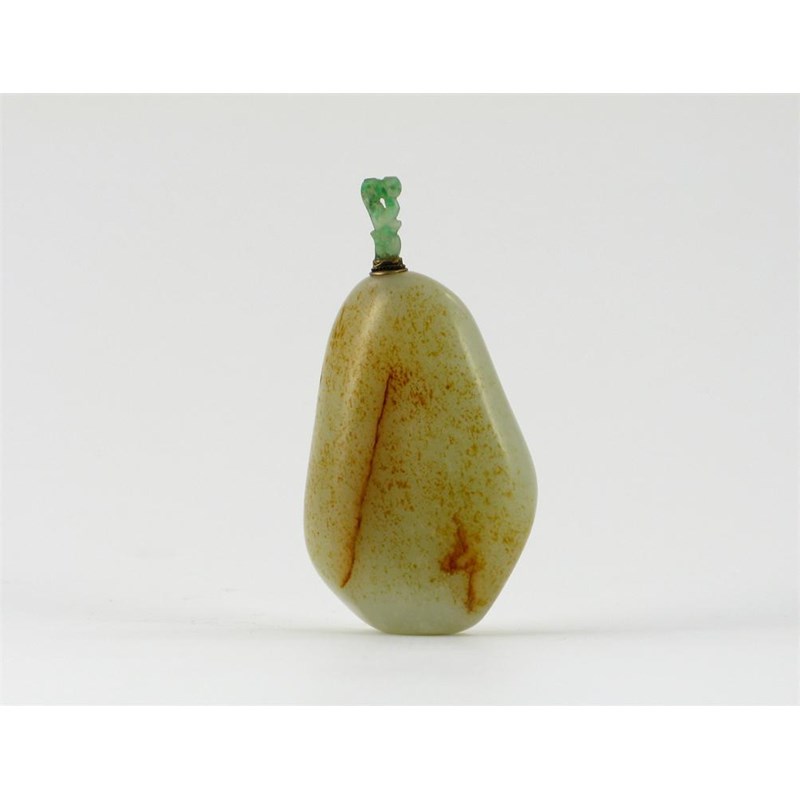 A Chinese jade snuff bottle, the pale celadon stone with brown striations on its smooth surface, the stopper an apple green leaf, 18th / 19th century, 9cm.