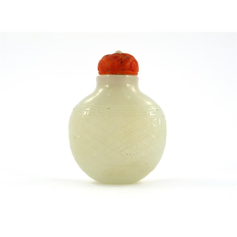 A Chinese jade snuff bottle, carved with a tied patterned sash around the body, with a coral stopper, 19th century, 7cm.