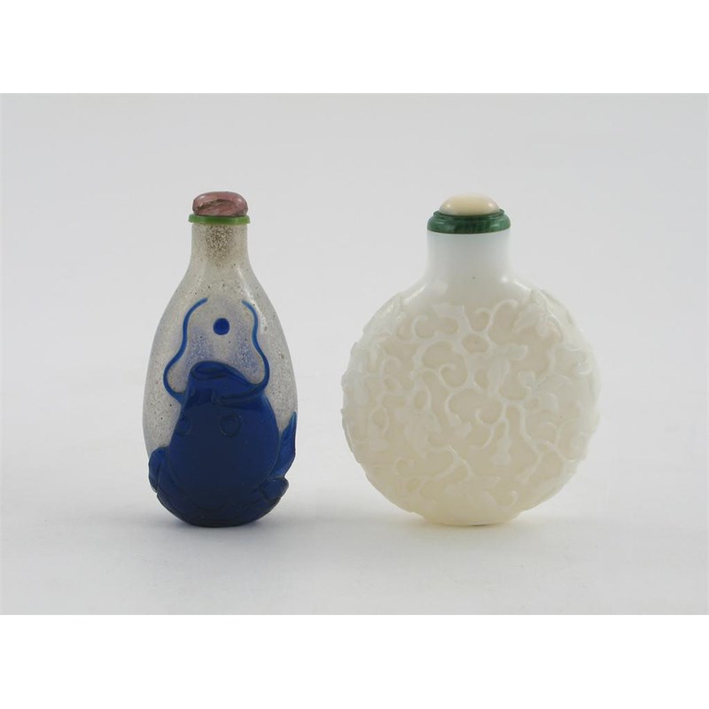 Two Beijing glass snuff bottles, one carved with gourds on leafy branches, the other with a blue fish on a snow-flecked ground, 8cm. (2)