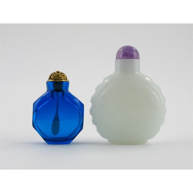 Two Chinese glass snuff bottles, one octagonal in blue glass, the other in opaque white glass carved with mallow flowers, 19th / 20th century, 6.8cm max. (2)