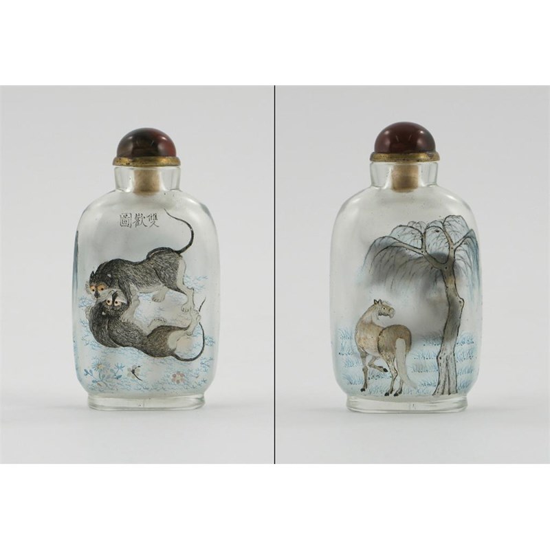 A Chinese interior-painted snuff bottle, painted with a horse beneath a tree and two fighting cocks, unsigned but probably by Ma Shaoxuau, early 20th century, 6.7cm.