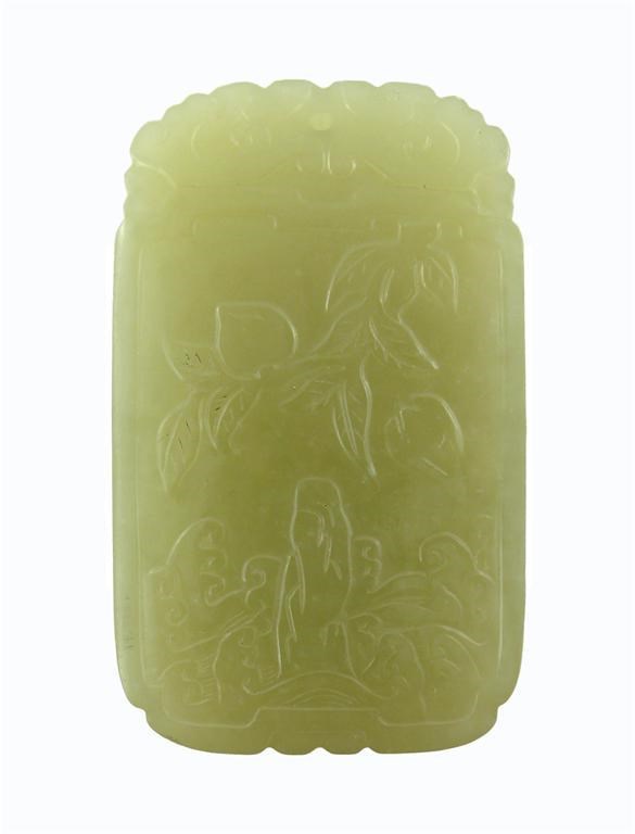 A Chinese yellow jade rectangular pendant, one side carved with a fruiting peach branch above breaking waves and rockwork, the reverse with a four character mark, 5.2cm.