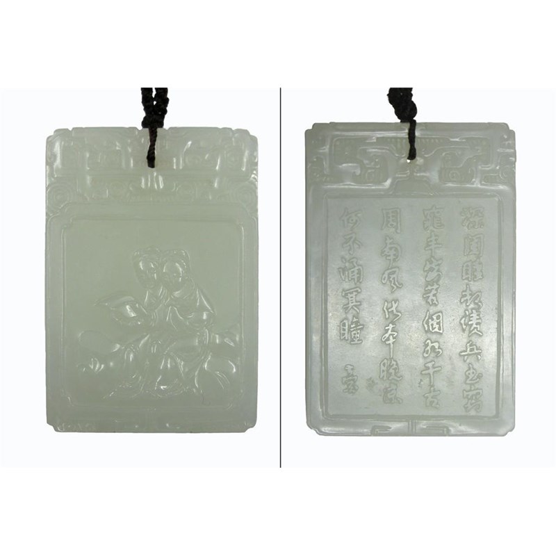 A Chinese white jade rectangular plaque, one side carved with two seated maidens, the reverse with four rows of calligraphy, 6cm.