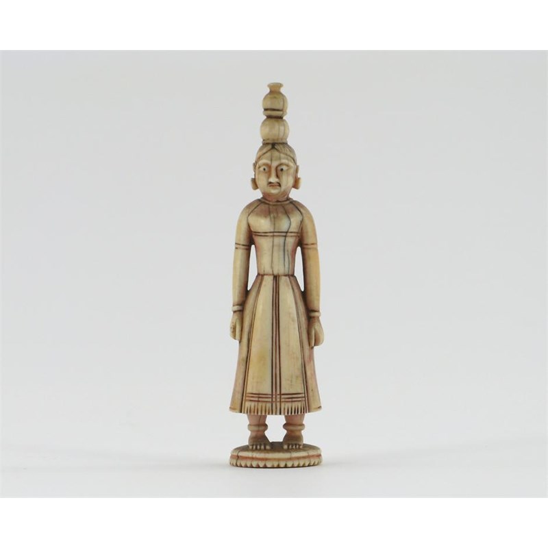 A small Indian ivory standing figure, of a woman carrying a gourd-shaped vase upon her head, probably 18th century, 10.8cm.