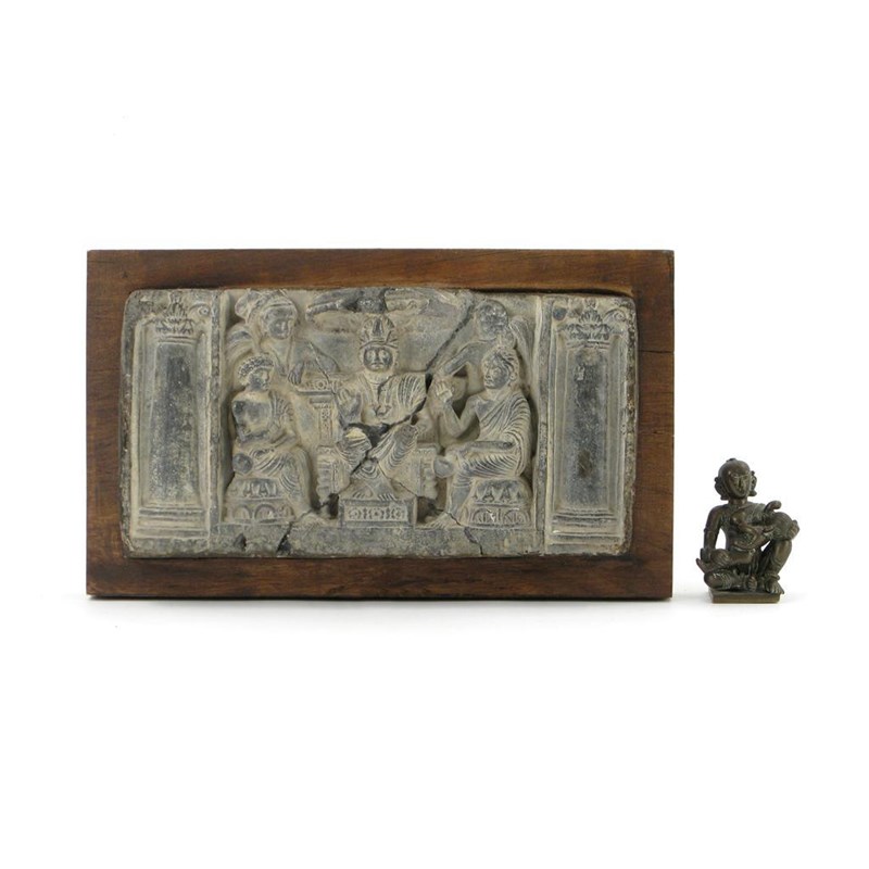 A Gandharan grey schist frieze, depicting a figure seated under a canopy surrounded by three attendants, and a small Indian bronze figure of a female suckling Ganesh, 2nd to 4th century and later, damaged, 28.5cm. (2)