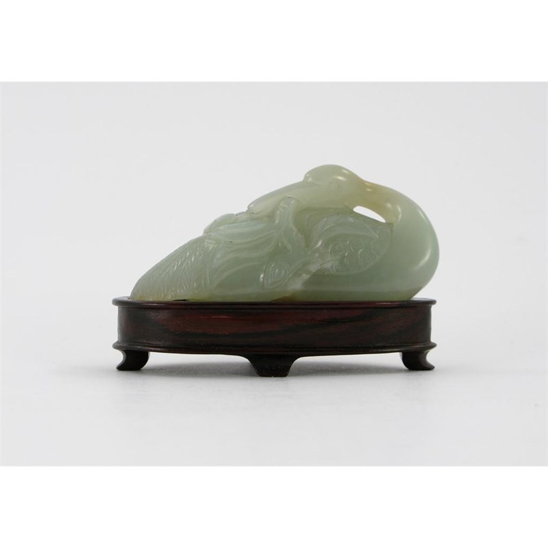 A Chinese pale celadon jade carving of a crane, its head turned backwards and holding a peach branch in its beak, 18th century, 7.5cm. Together with a wood stand. (2)