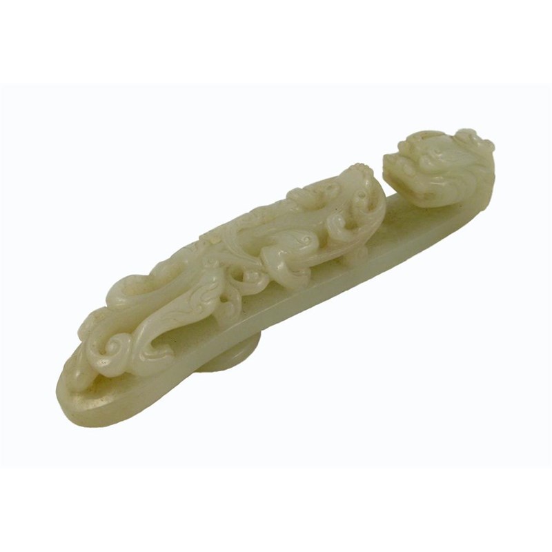 A Chinese white jade belt hook, with a dragon's head terminal and a scrolling chilong, 18th / 19th century, 13.8cm.