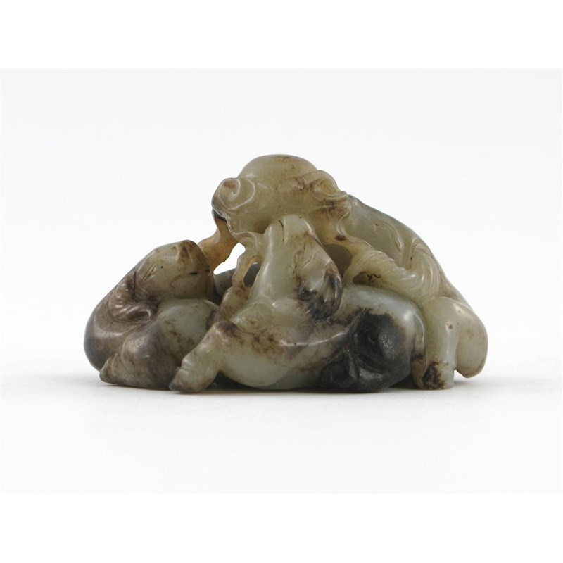 A Chinese jade carving of three goats or rams, the greyish stone flecked with black, probably 17th century, 8cm.