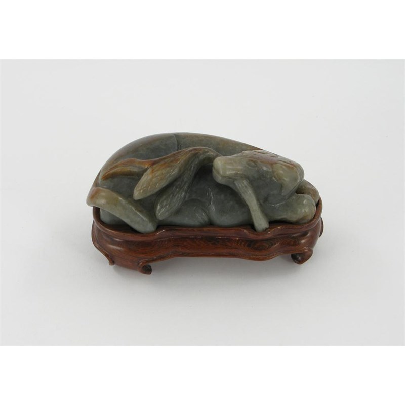 A Chinese jade carving of a recumbent dog, his head turned back over his shoulder and holding a millet branch in his mouth, 18th century, 9.5cm. Together with a wood stand. (2)