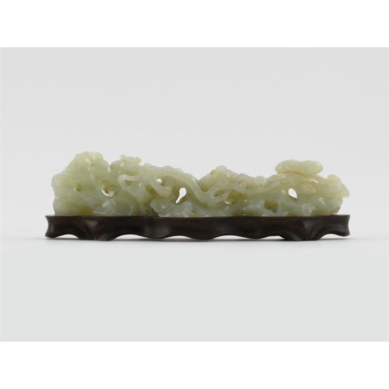 A Chinese pale celadon jade brush rest, carved as flowering prunus branches and sacred fungus, upon pierced rockwork, 19cm. Raised on a hardwood stand. (2)