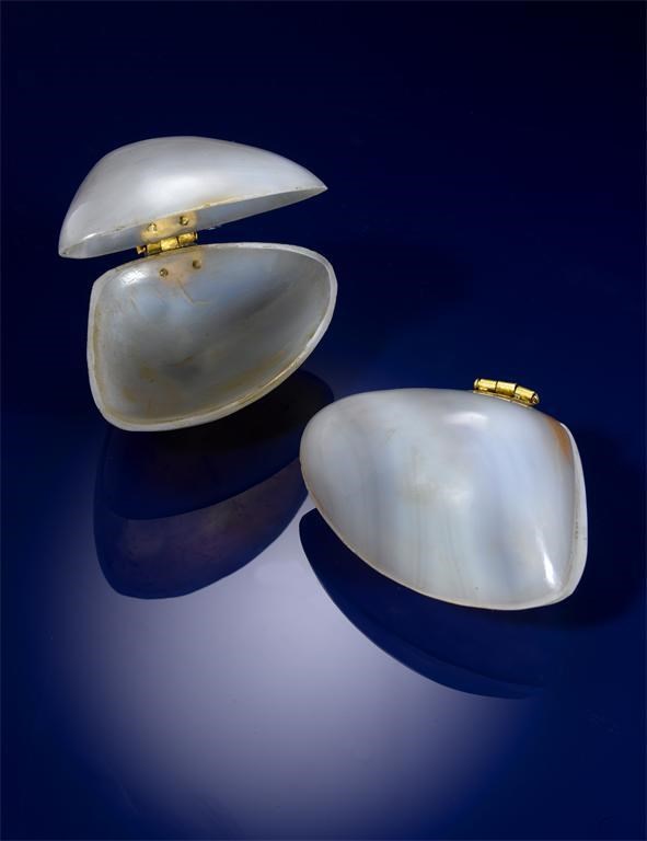 A rare pair of Chinese agate shell-shaped boxes, each mounted with a gold hinge, finely punched with small circles, probably Tang dynasty, 6.5cm. (2)