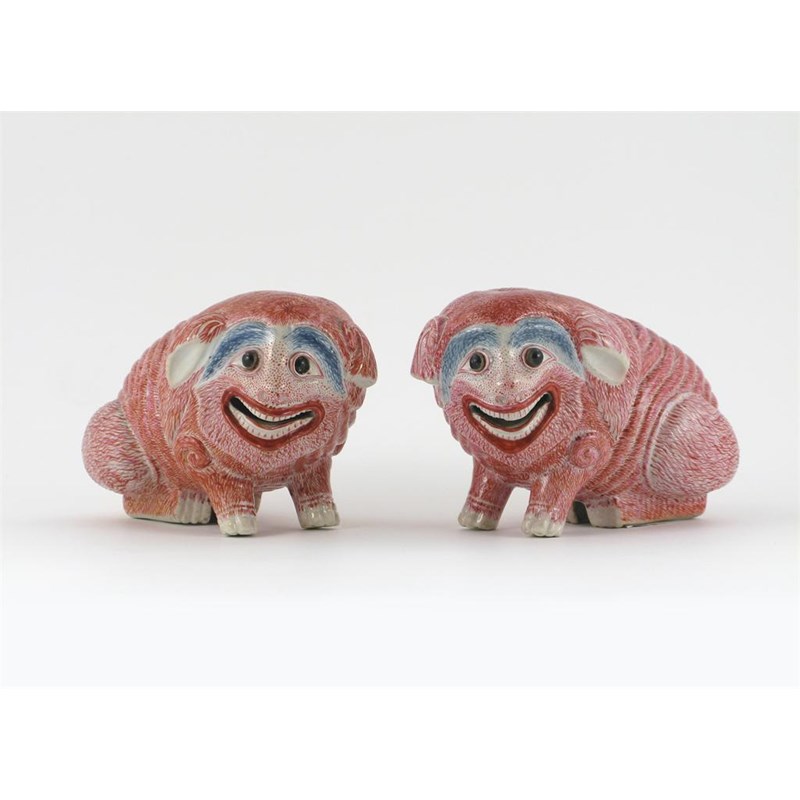 A rare pair of Chinese models of dog-like beasts, each crouching with his head slightly turned, their wrinkled coats picked out in pink, their eyebrows blue and their eyes black, 18th / early 19th century, 14.5cm. (2)