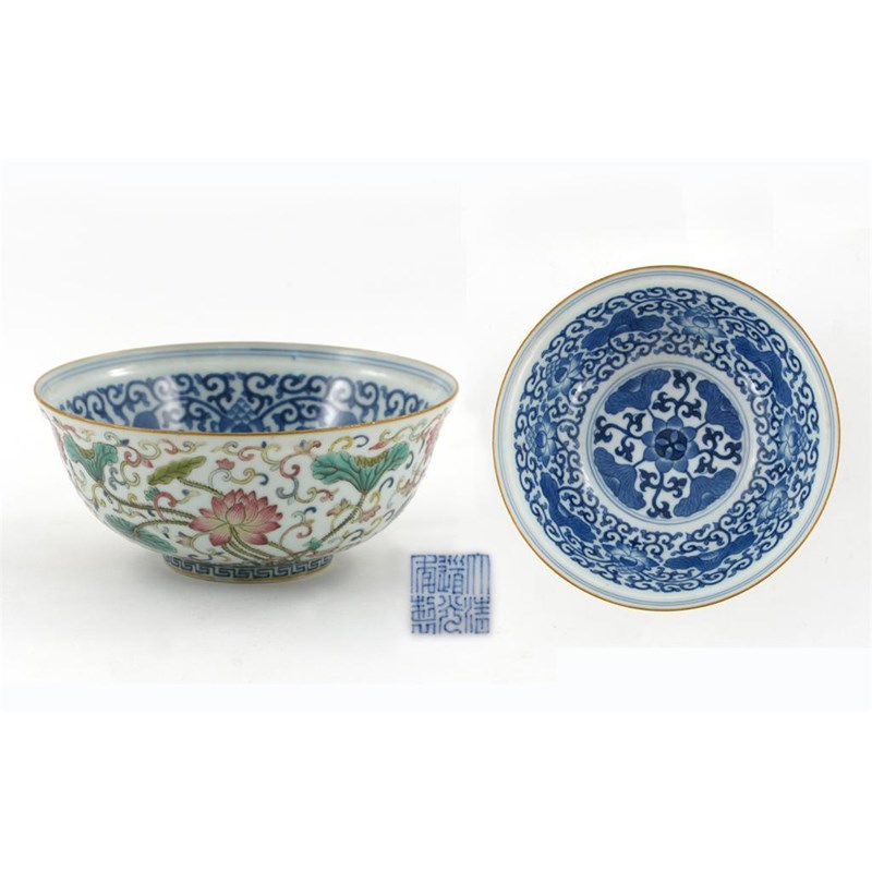 A good Chinese famille rose bowl, the interior painted in underglaze blue with lotus flowers and leaves amidst a wide band of tendrils, the exterior delicately enamelled with lotus above a short foot decorated in blue key fret, the base with a six character Daoguang seal mark and of the period 1821-50, 14.8cm. Together with a hardwood stand. (2)