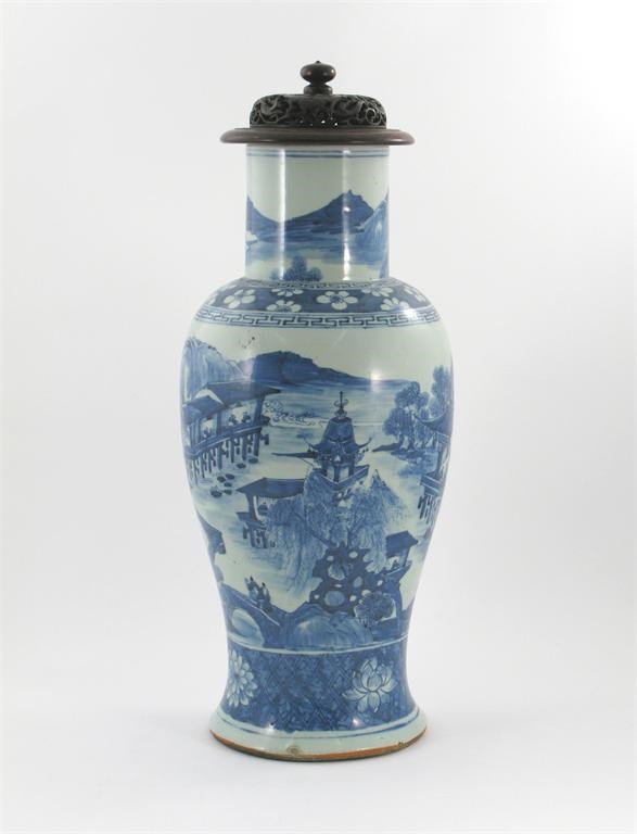 A large Chinese blue and white baluster vase, painted with small figures and pagodas in a watery mountainous landscape, 19th century, wood cover, minor faults, 63cm. (2)