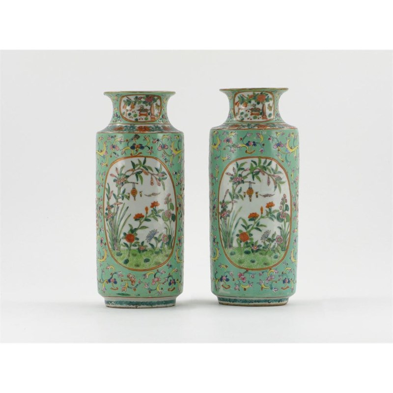 A pair of Chinese cylindrical vases, each painted with panels containing flowers, flags and bats, on a green ground decorated with formal flowers and foliage, each with a six character Jiaqing seal mark and probably of the period, 24.6cm. (2)