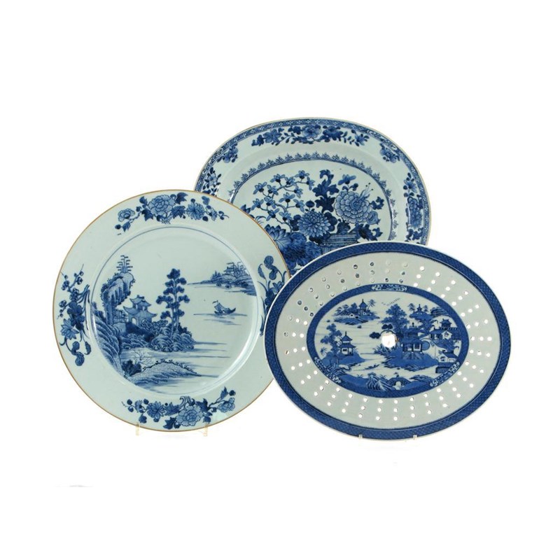 A Chinese blue and white plate, painted with a watery landscape, an oval dish painted with lotus, magnolia and chrysanthemum, and a strainer with a pagoda landscape, 18th / early 19th century, the oval dish cracked, 38cm max. (3)