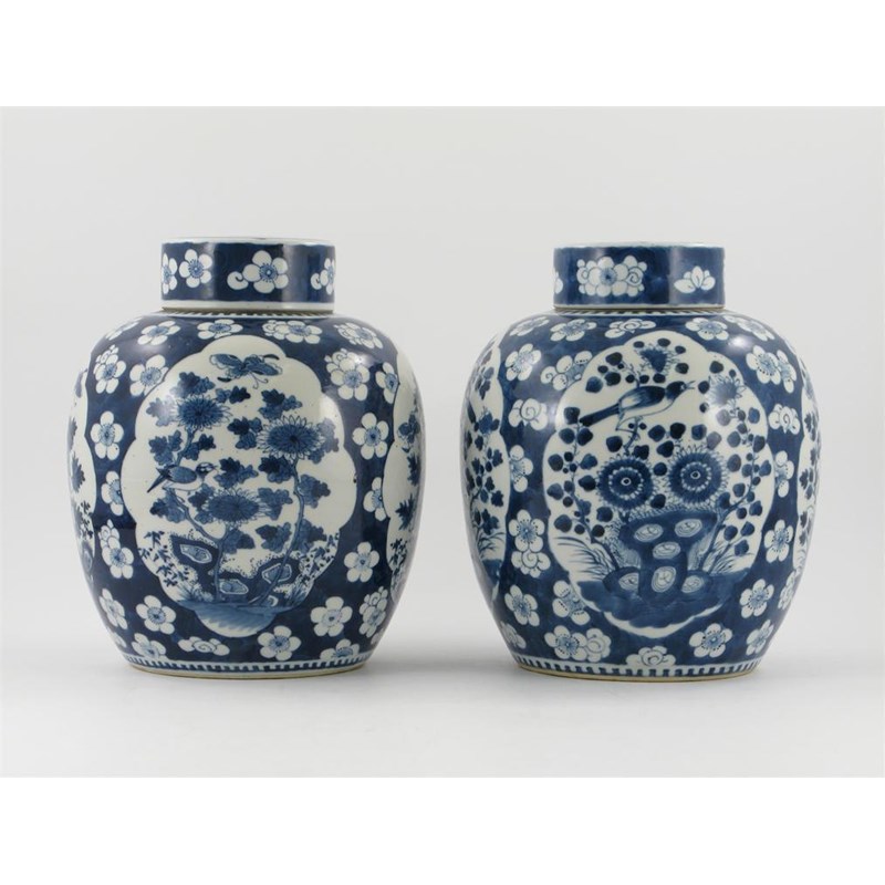 A large pair of Chinese blue and white prunus vases and covers, each painted with four panels of birds and flowers, late 19th century, 28.5cm. (4)