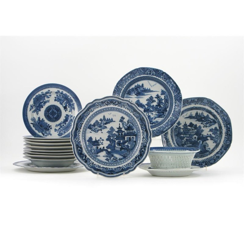 Chinese blue and white porcelain, most decorated with the Aster and Fitzhugh patterns, 18th and 19th centuries, minor damages. Comprising: a reticulated basket and stand, nine soup plates, and nine other pieces. (15)
