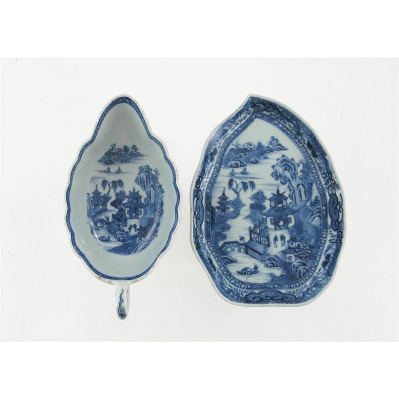 A Chinese blue and white leaf-shaped dish, and a Chinese fluted sauceboat, each piece painted with a watery pagoda landscape, 18th century, minor faults, 19cm max. (2)