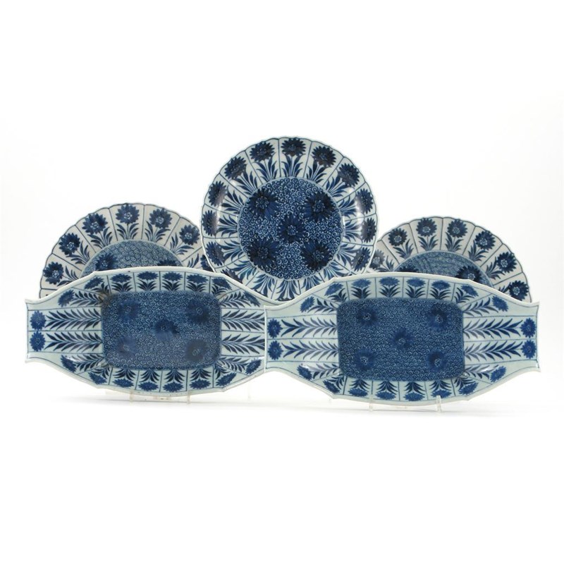 A pair of Chinese shaped rectangular dishes, two plates and a saucer dish, all decorated with the Aster pattern, 18th century, 30.5cm max. (5)