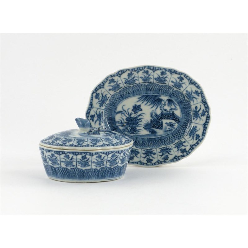 A Chinese blue and white oval butter dish, cover and stand, decorated with flowers and foliage, 18th century, 15.5cm. (3)
