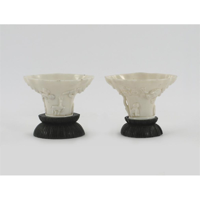 Two Chinese blanc de Chine libation cups, moulded and applied with deer, dragons, other animals and trees, one with an incised mark to the base, 18th century, 10.5cm. Each with a carved hardwood stand. (4)