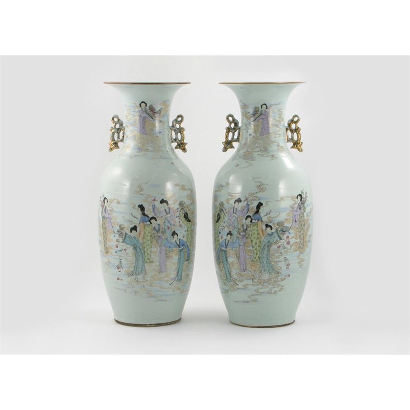 A pair of large Chinese famille rose vases, each painted with beautiful maidens amidst clouds and flowers, and with calligraphy to the reverse, 19th / 20th century, 57cm. (2)