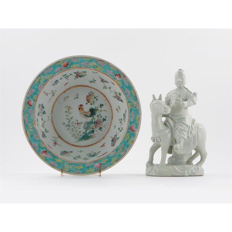 A Chinese blanc de Chine model of the warrior Guandi, riding Red Rabbit, and a famille rose bowl, the interior painted with a cockerel amidst flowers and insects, the exterior with iron red leaf branches, 19th century, some damages, 29.3cm max. (2)