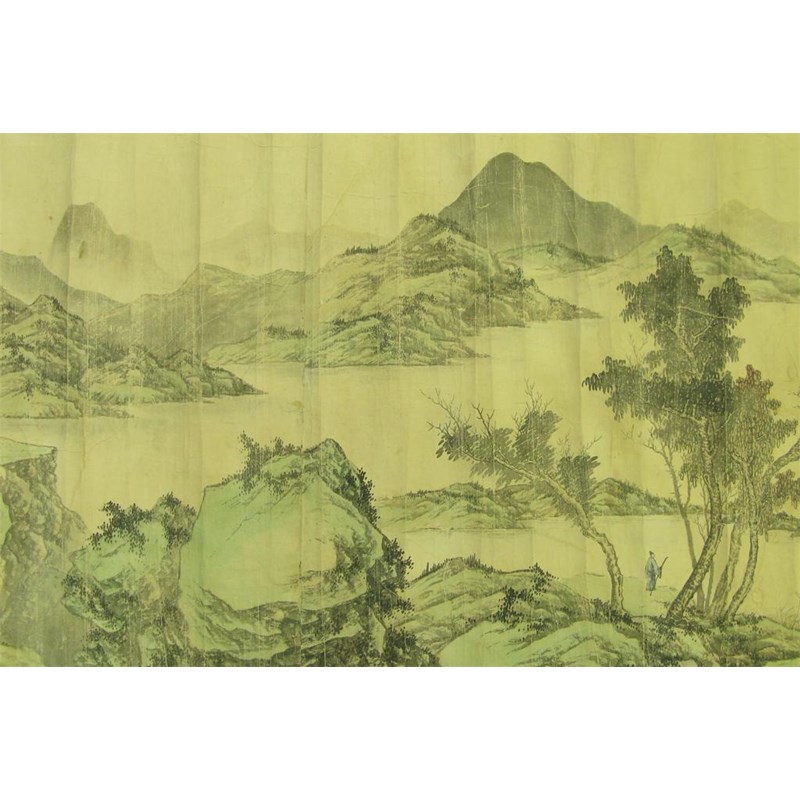 A Chinese scroll painting, of an extensive mountainous landscape, predominantly in greens and grey, between panels of calligraphy, 19th / 20th century, 680cm x 63cm.