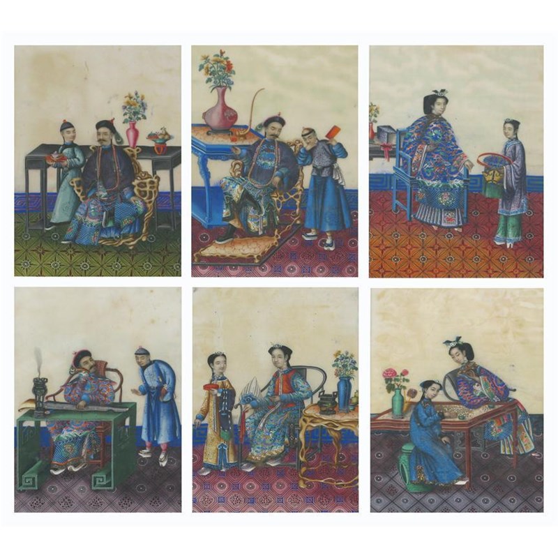 A set of eight Chinese pith paper paintings, depicting figures at various pursuits in interiors, 19th century, some damages, 25.5cm. Framed and glazed. (8)