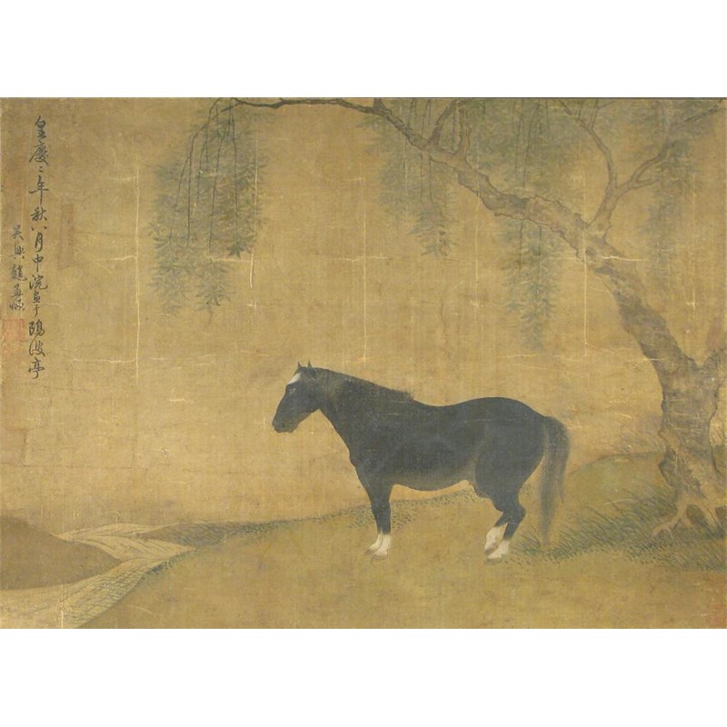 A Chinese painting of a black horse, standing beneath a willow tree, with two lines of calligraphy and four seals, inscribed Zhao Mengfu and with a date corresponding to 1313 but later, old restoration, 66cm.